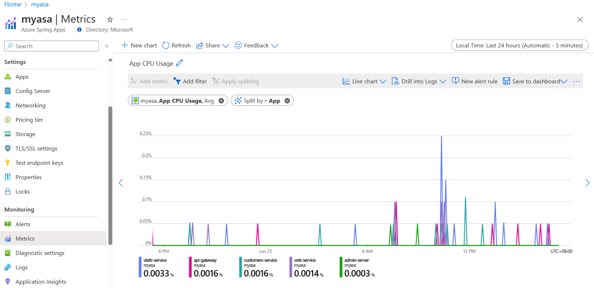 Azure Spring 應用程式預設會提供數個計量,包括可用性、效能、HTTP 要求數、資料庫連結數等計量。 這些計量對於釐清目標、尋找改進之處及制定特定改進措施非常重要。 如需詳細資訊,請參閱:Azure Spring Apps 的計量。
