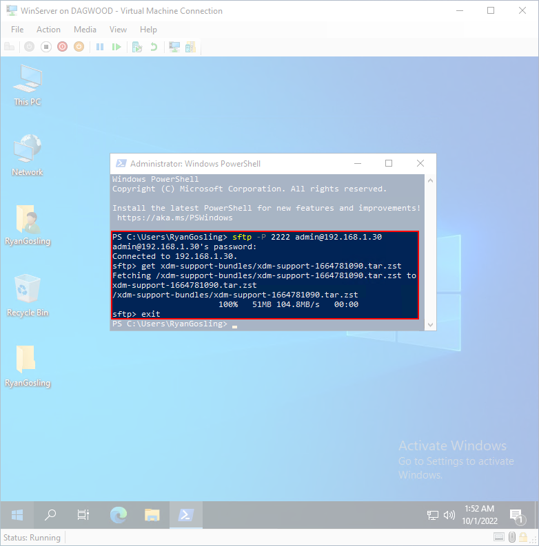 使用 VM 的主機,輸入代理提供的命令以獲取支援包的副本。 在與 VM 的初始連接期間,系統可能會提示您信任主機,並顯示 ECDSA(橢圓曲線數位簽名演算法)金鑰。 這些命令區分大小寫,並且提供的標誌是大寫 P的 .