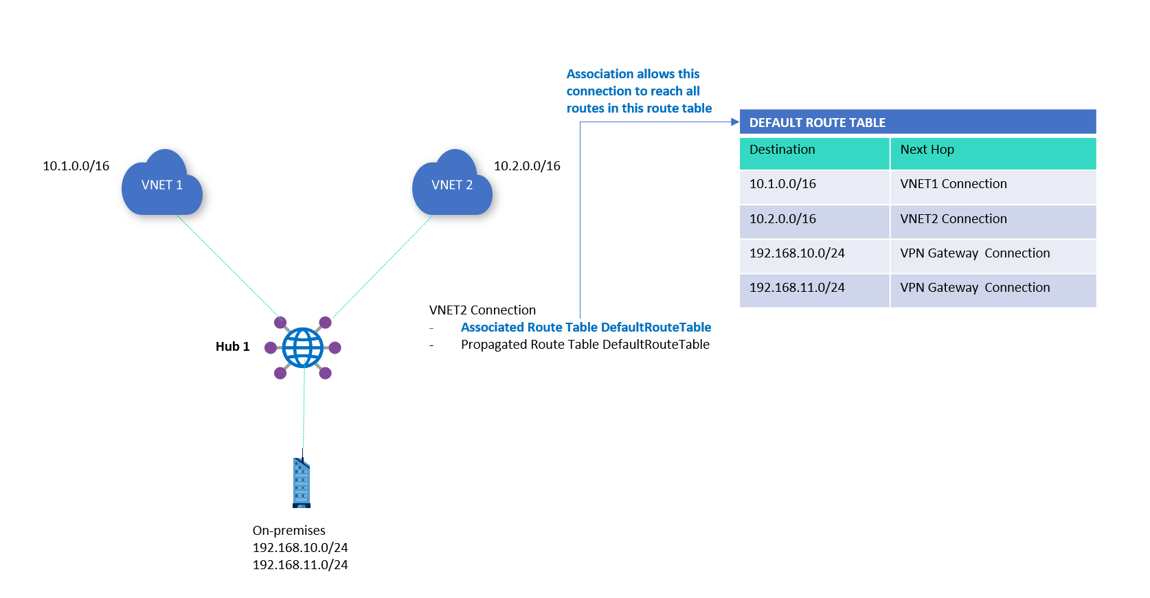 連線會動態地將路由傳播至路由表。 使用 VPN 連線、ExpressRoute 連線或 P2S 設定連線時,會使用 BGP 將路由從虛擬中樞傳播到內部部署路由器。 路由可以傳播至一或多個路由表。