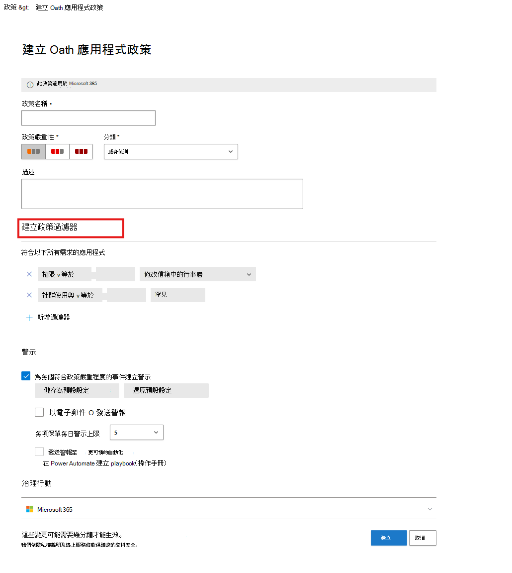 如果您已啟用 App 治理,也可以指定應用程式治理警示的條件,並為組織實施應用程式合規政策。 欲了解更多資訊,請參閱 應用治理中的「建立應用程式政策」。