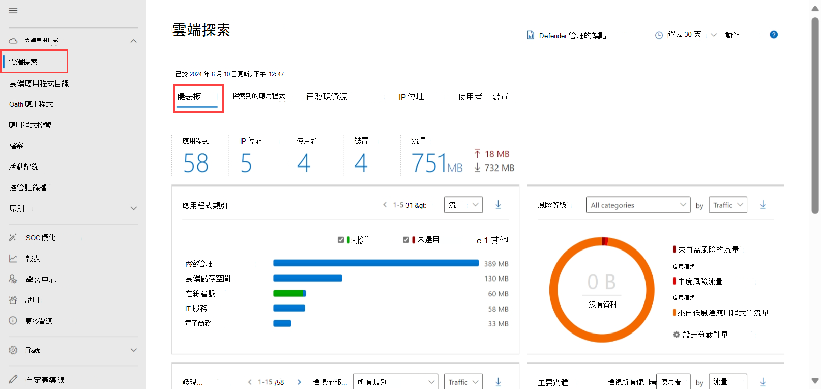 [雲端探索] 頁面提供一個儀錶板,其設計目的是讓您深入瞭解雲端應用程式在組織中的使用方式。 儀錶板可讓您快速檢視所使用的應用程式類型、開啟的警示,以及組織中應用程式的風險層級。 它也會顯示您最常使用的應用程式使用者,並提供 應用程式標頭位置 對應。