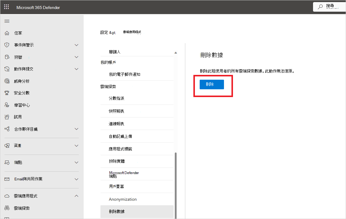 1. 在 Microsoft Defender 入口網站中,選> [設定Cloud Apps>Cloud Discovery>刪除數據]