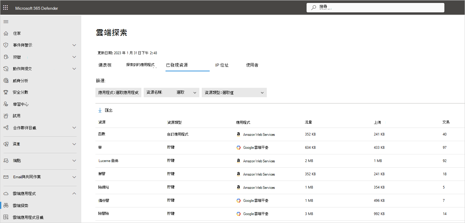 1. 在 Microsoft Defender 入口網站的 [Cloud Apps] 下,選取 [雲端探索]。 然後選擇 [ 探索到的資源] 索引 標籤。