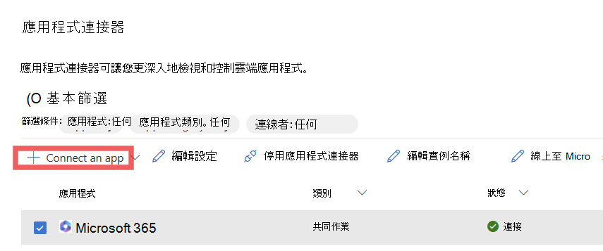 在 應用程式連接器頁面 ,選擇 +Connect a app,然後選擇 Microsoft 365。