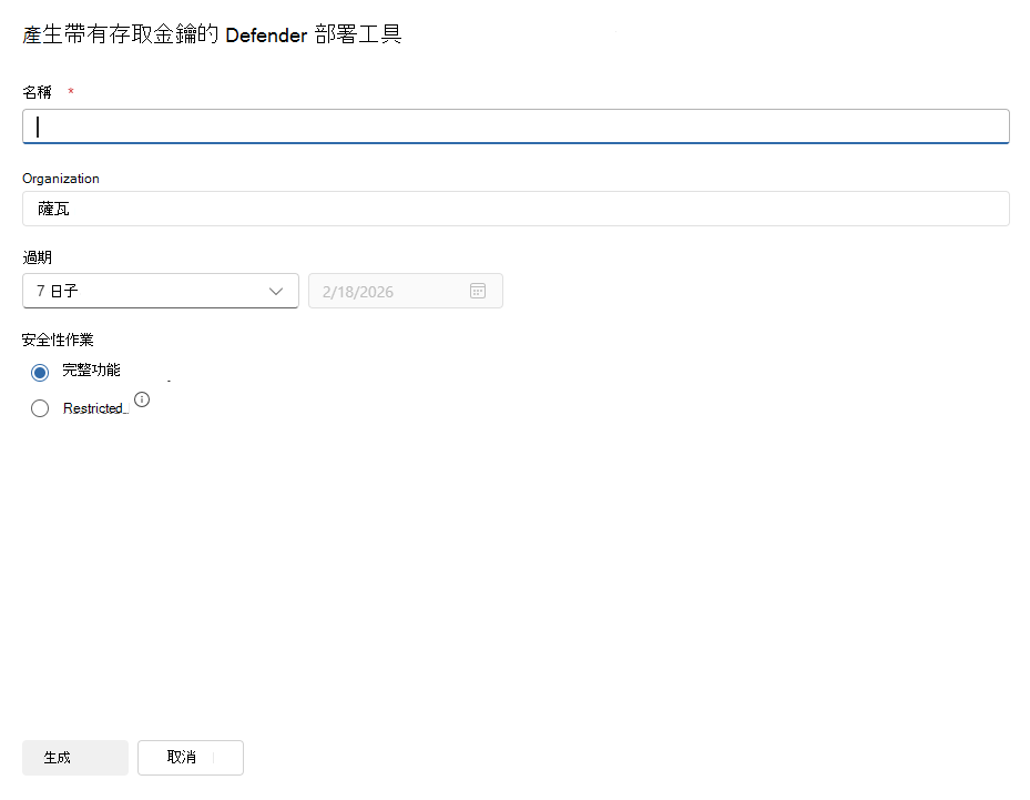 會出現 帶有存取金鑰頁面的「產生 Defender 部署工具 」。