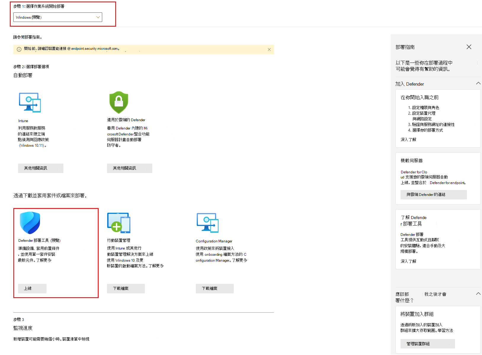 Defender 部署工具支援以下作業系統:Windows 7 SP1、Windows Server 2008 R2 SP1、Windows Server 2012 R2、2016、2019、2022、2025、Windows 10 (版本 1809 及更新) ,以及所有版本的 Windows 11。