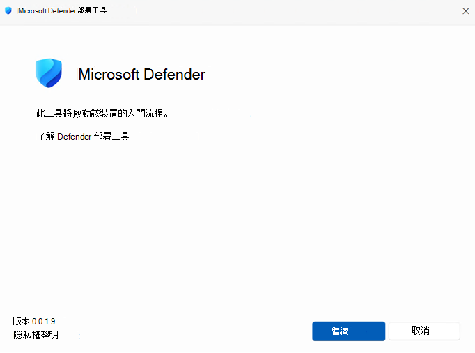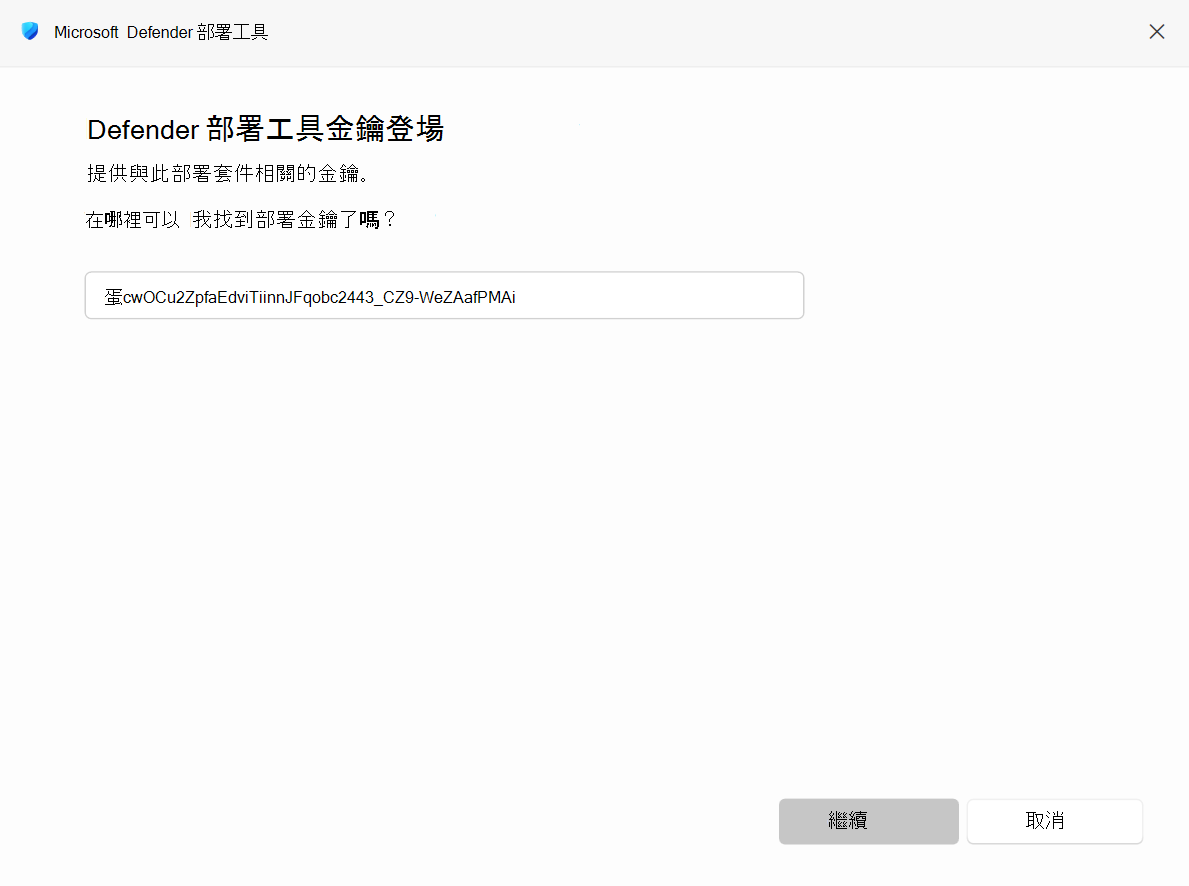 輸入你從入口網站複製的 Defender 部署工具金鑰,然後選擇 繼續。