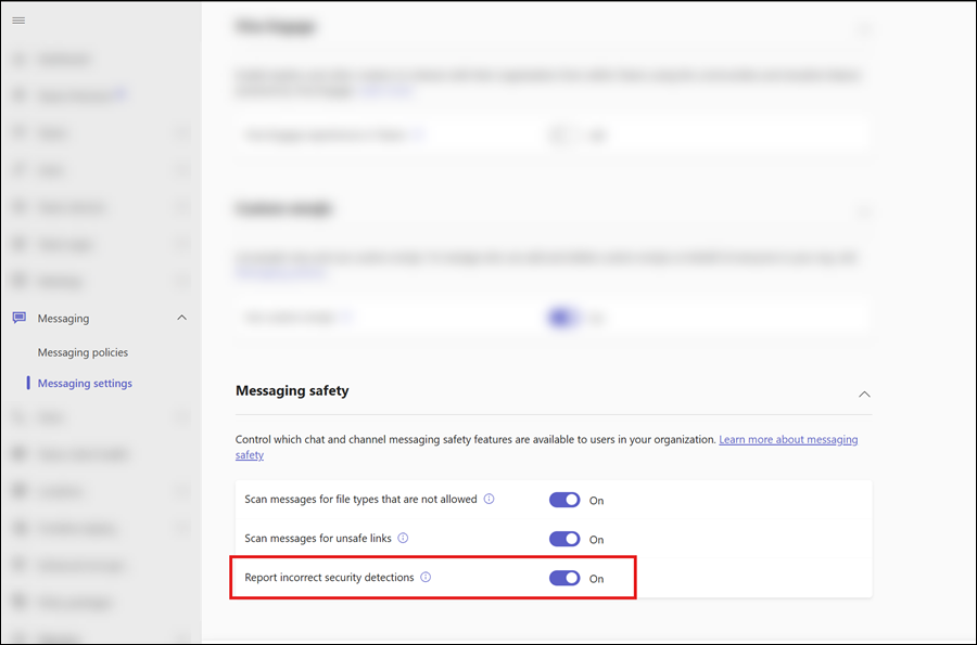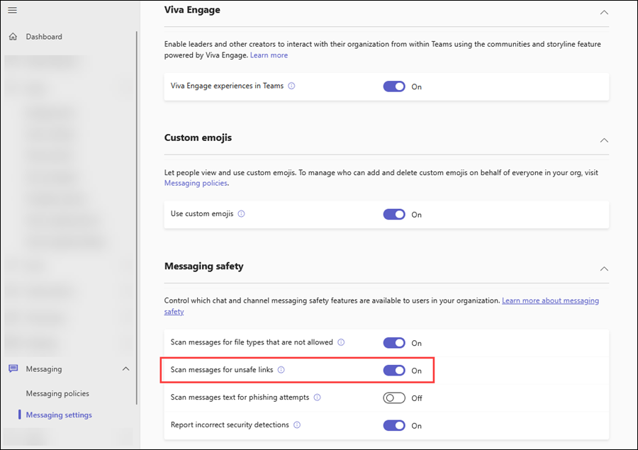 開啟,然後選擇 儲存。在 Teams 管理中心,請前往 訊息設定 頁面 https://admin.teams.microsoft.com/messaging/settings。