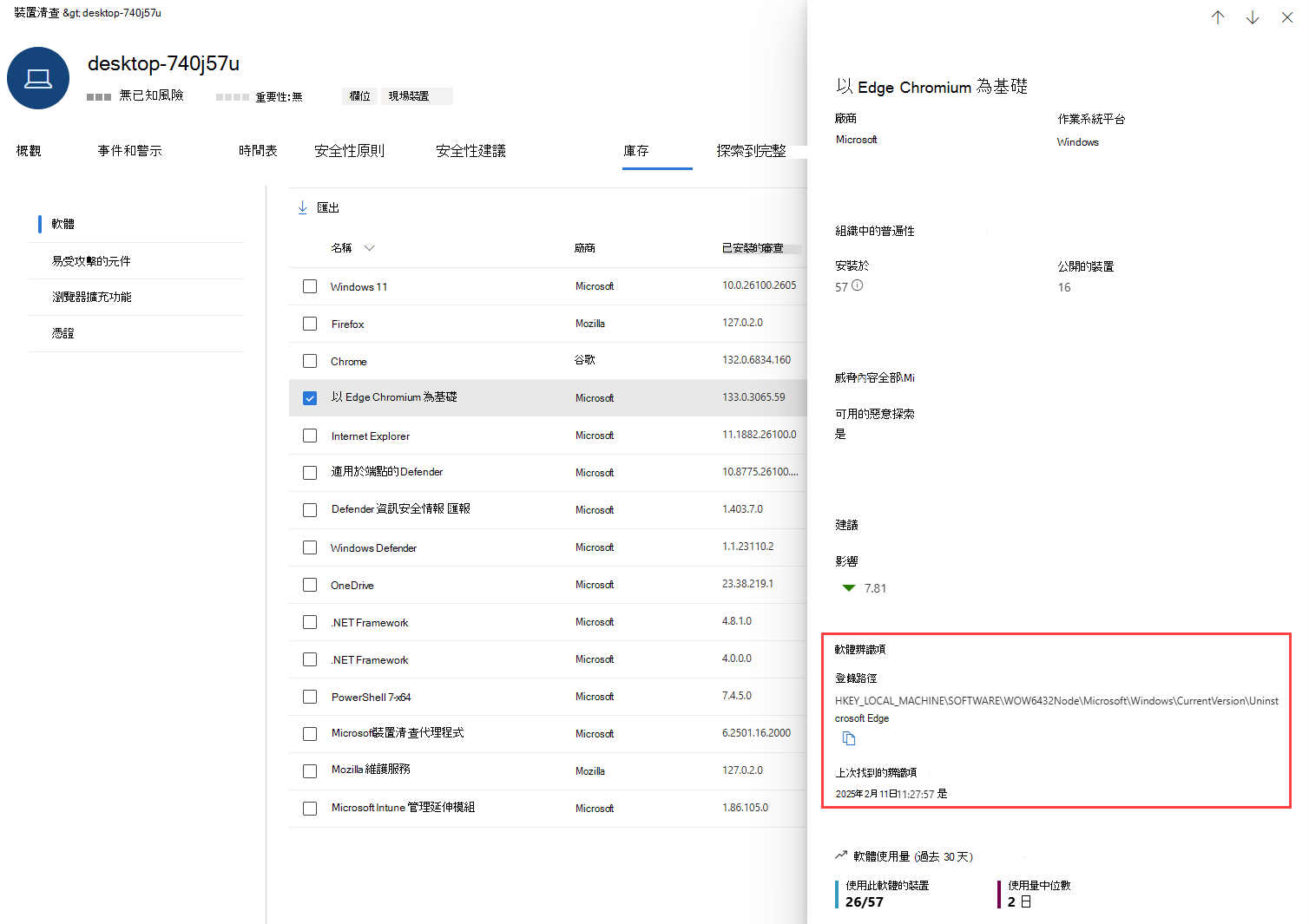 - 安裝了軟體的裝置 (連同裝置名稱、網域、作業系統等) 。