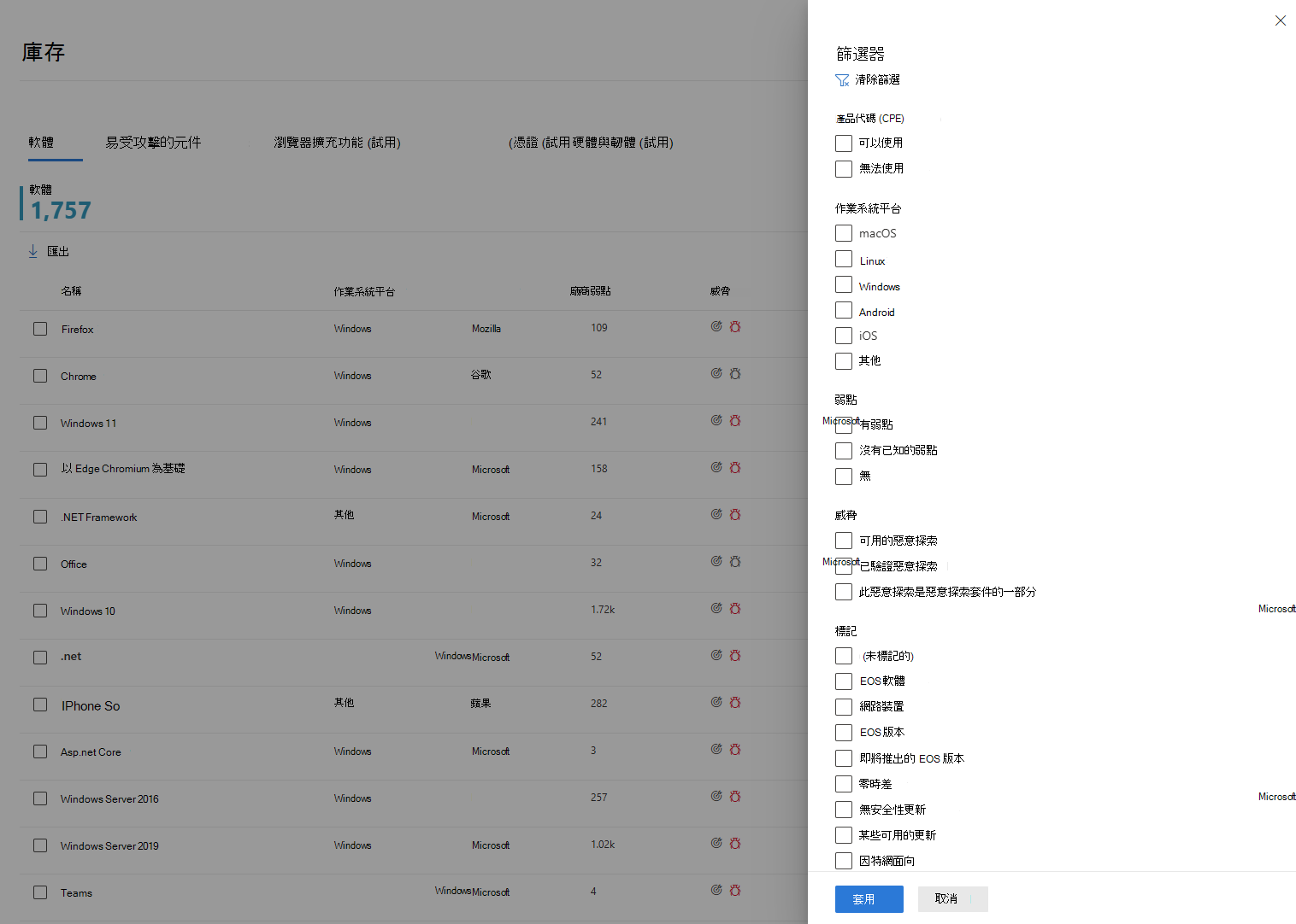你可以根據產品程式碼篩選清單檢視, (CPE) 、作業系統平台、軟體的弱點、相關威脅,以及軟體是否已終止支援等標籤。