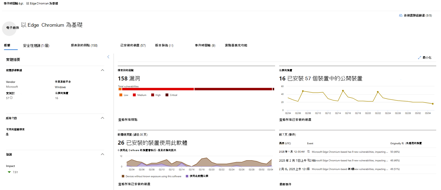 - 資料視覺化顯示發現的弱點數量與嚴重程度、暴露裝置、過去30天軟體使用情況,以及過去7天的主要事件。