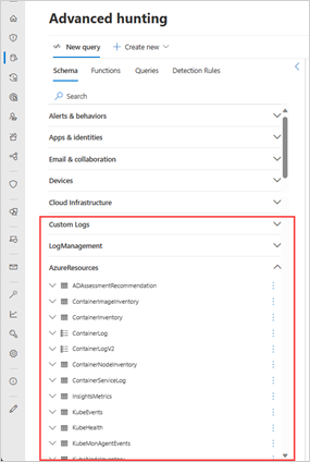 當你第一次在連接工作區後打開進階搜尋頁面時,可以在 Schema 標籤下看到許多該工作區的表格依解決方案排列,接著是 Microsoft Defender 全面偵測回應表。