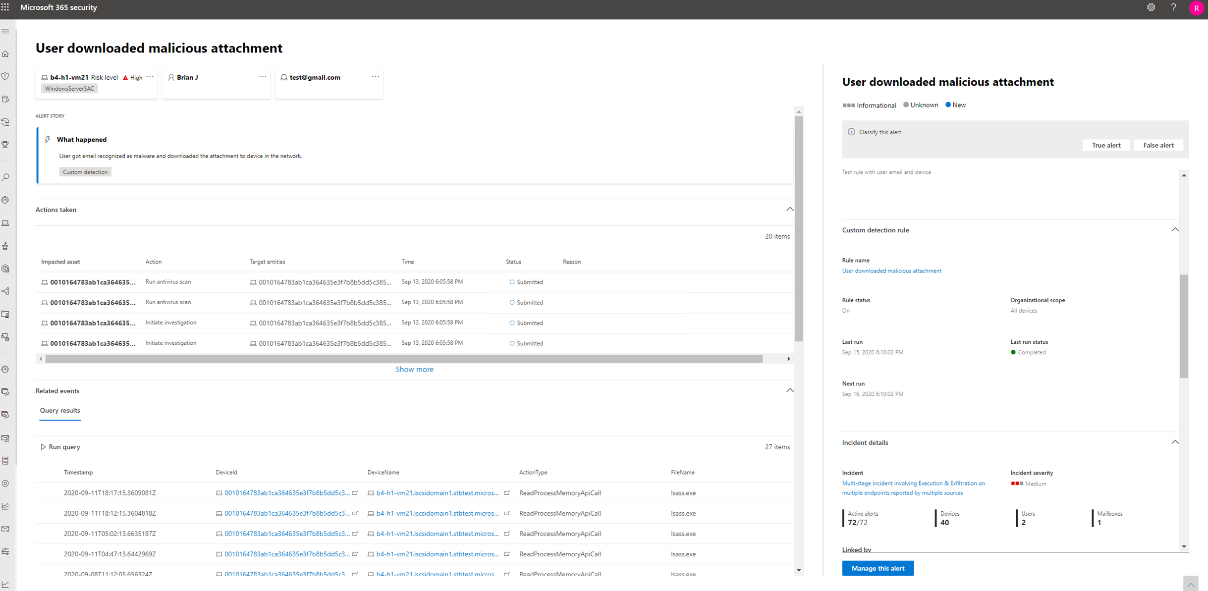 - 不會被 適用於端點的 Microsoft Defender 抑制規則所抑制。 為防止對特定使用者、裝置或信箱產生警報,請修改相應查詢,明確排除這些實體。