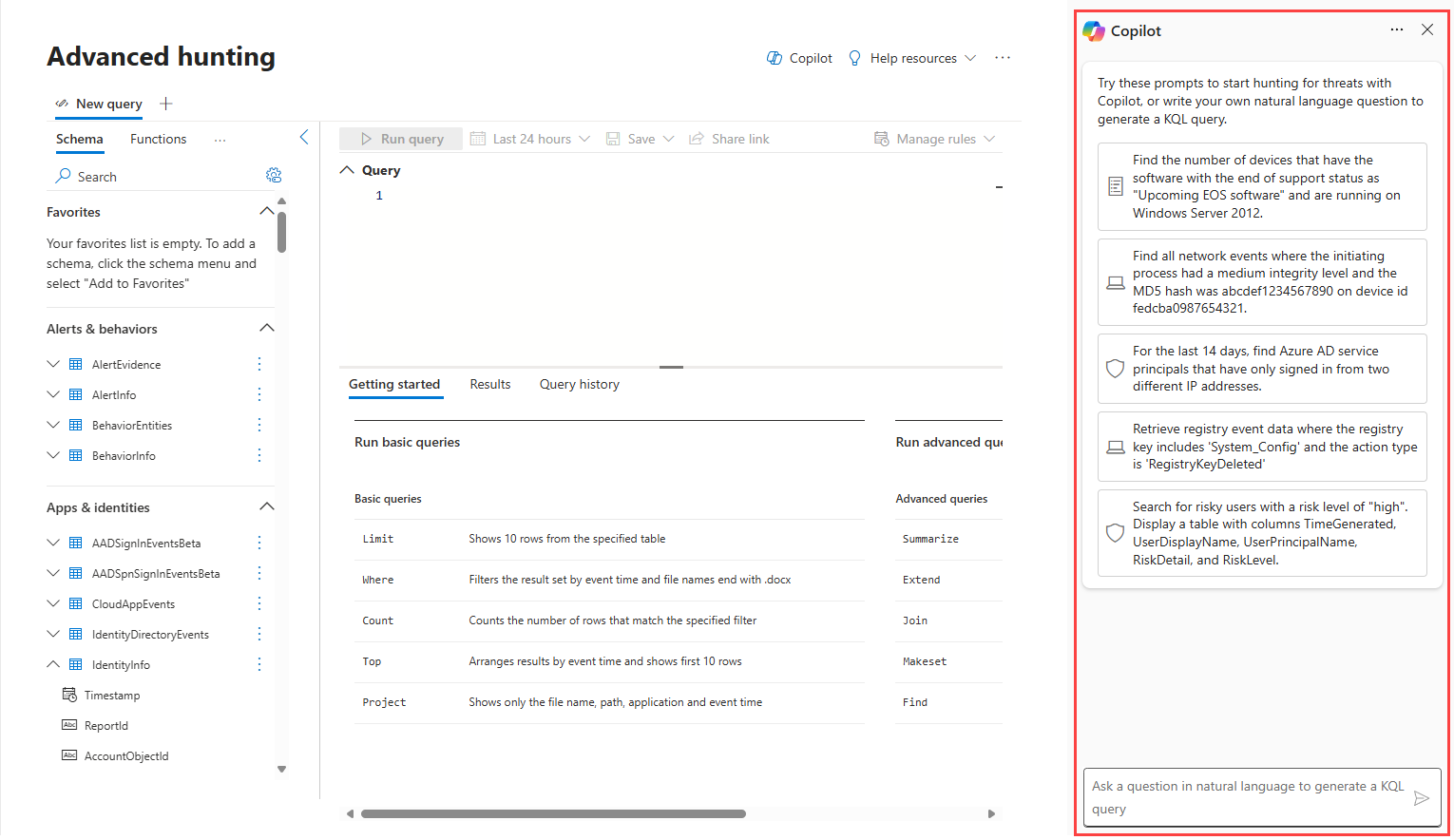 從 Microsoft Defender 入口網站的導覽欄開啟進階狩獵頁面。 適用於進階搜捕的安全性 Copilot 側邊窗格會在右側顯示。