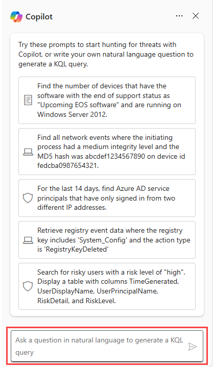 在 Copilot 提示欄中,提出任何你想執行的威脅狩獵查詢,然後按下