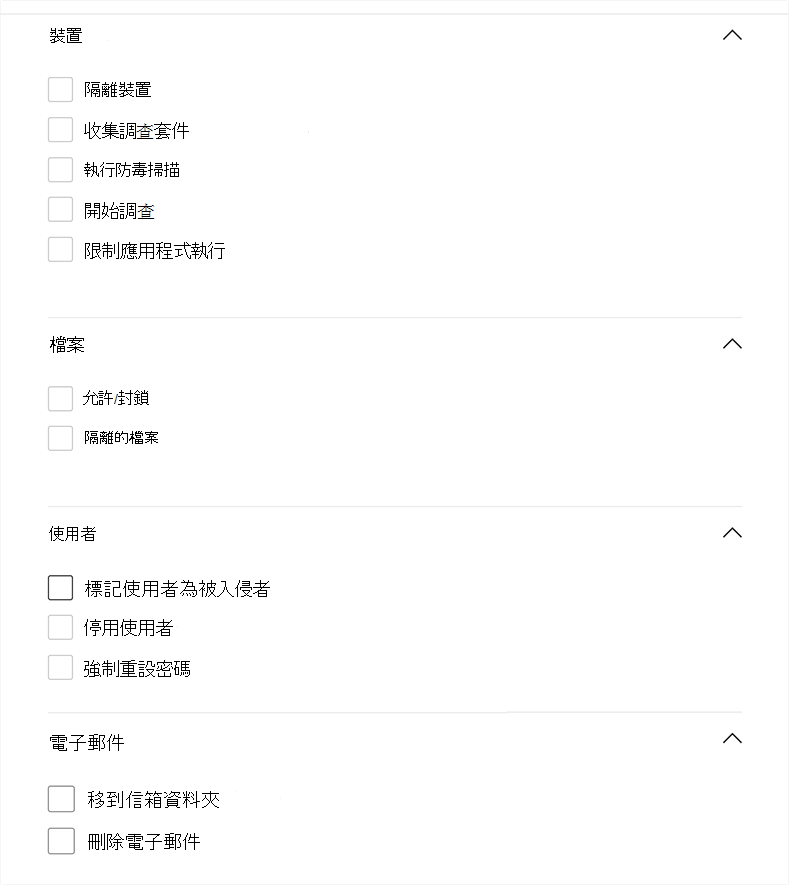如果你的自訂偵測規則使用 Defender 全面偵測回應資料,它可以自動對查詢回傳的裝置、檔案、使用者或電子郵件採取行動。