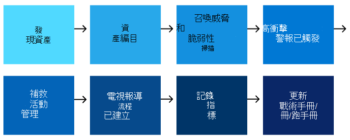 另一個可用場景是威脅與漏洞掃描。 在此範例中,SOC 要求透過核准的流程(包括資產掃描)來修復威脅與漏洞。