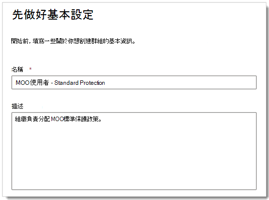 當你試行 Microsoft Defender for Office 365 時,可能會先試行特定使用者,再啟用並執行整個組織的政策。 建立分發群組有助於管理部署流程。 例如,建立像 Defender for Office 365 Users - Standard Protection 這類群組、Defender for Office 365 Users - 嚴格保護、Defender for Office 365 Users - 自訂保護,或 Defender for Office 365 Users - 例外。