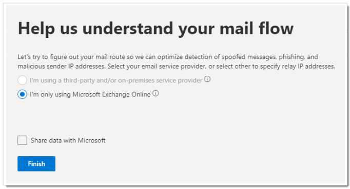 在「 幫助我們理解您的郵件流程 」對話框中,根據我們偵測到您網域的 MX 紀錄,會自動選擇以下選項之一: