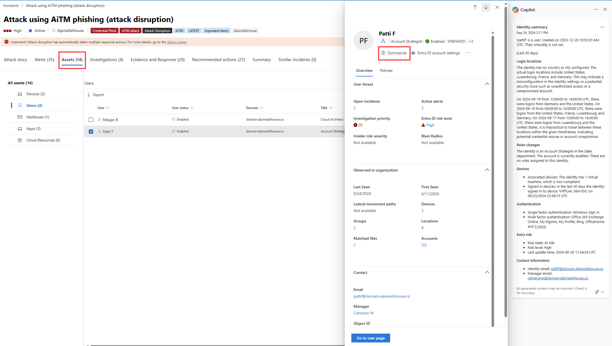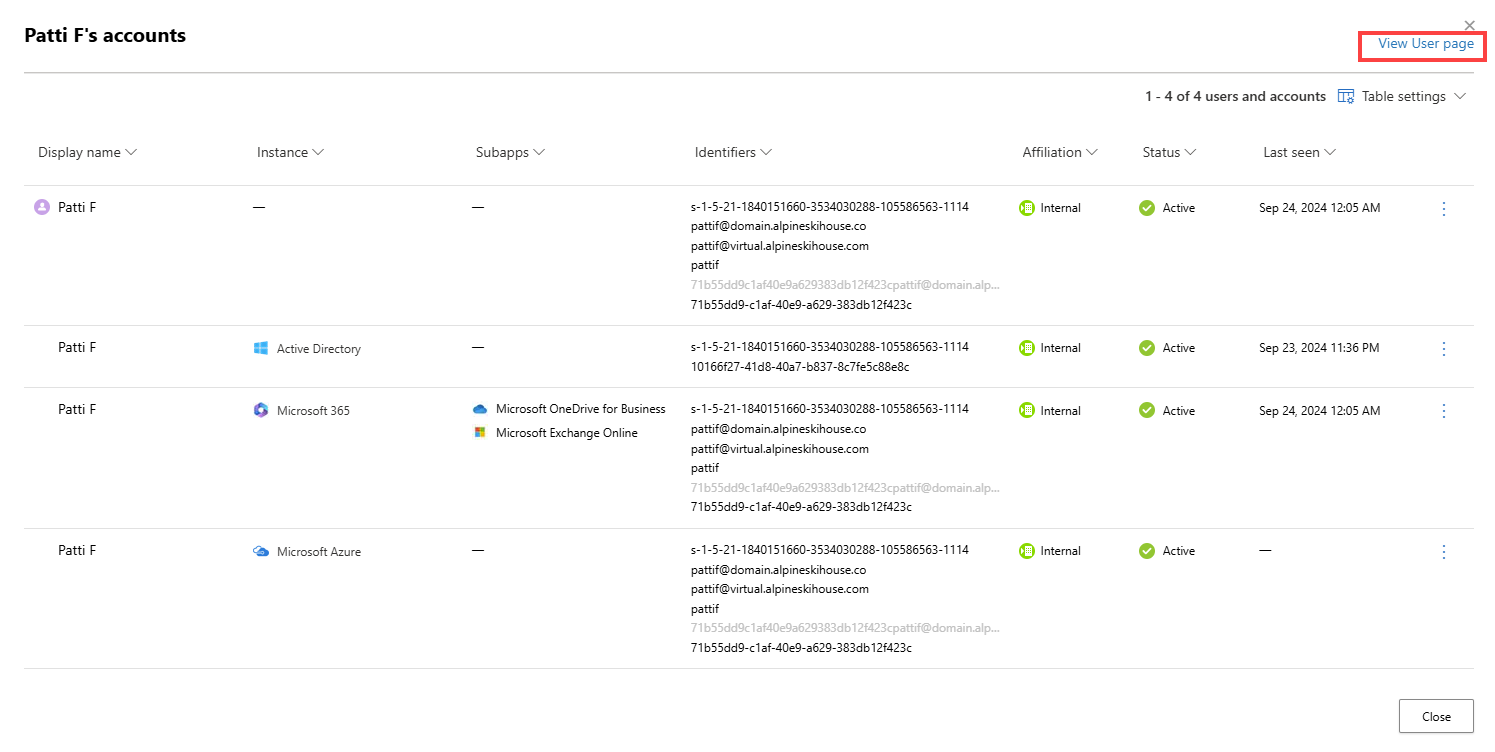 從主選單中,進入資產>識別。 從列表中選擇一個使用者名稱,然後選擇 「檢視使用者頁面 」以開啟使用者頁面。 Copilot 會自動產生身份摘要,並在開啟使用者頁面時顯示側邊面板。