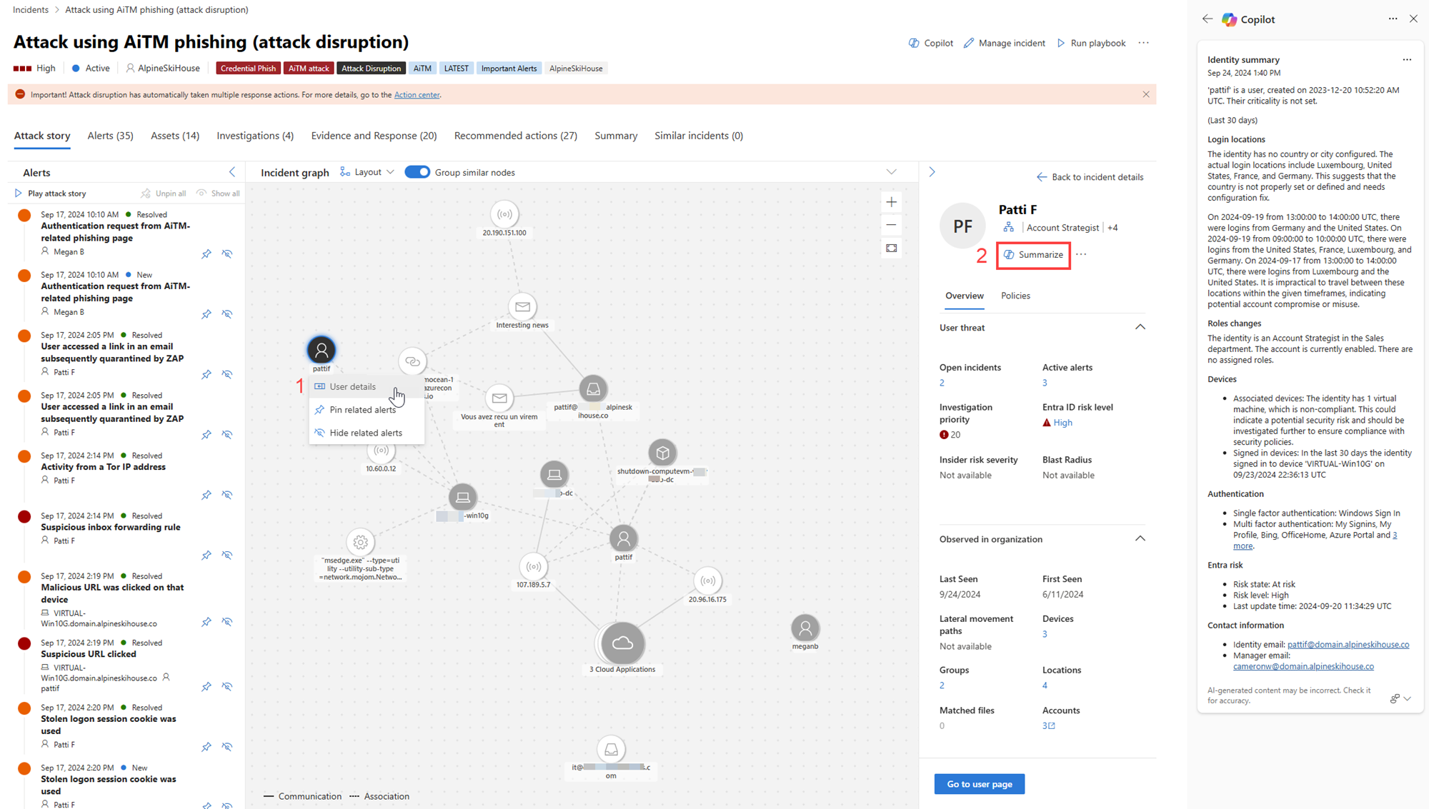 在事件頁面中,選擇事件圖表上的一個身份,然後 (1) 選擇 使用者詳細資料。 在使用者資料欄中, (2) 選擇 「摘要」。 結果顯示在副駕駛側面板。