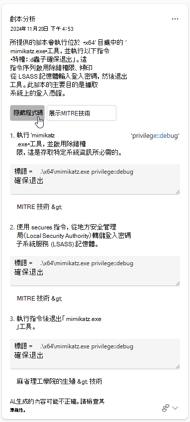選擇 顯示 MITRE 技術 ,以查看與腳本相關的 MITRE ATT&CK 技術。 這些資訊有助於你了解腳本所使用的技巧,以及它如何影響你的環境。 選擇 隱藏 MITRE 技術 以關閉擴充包。