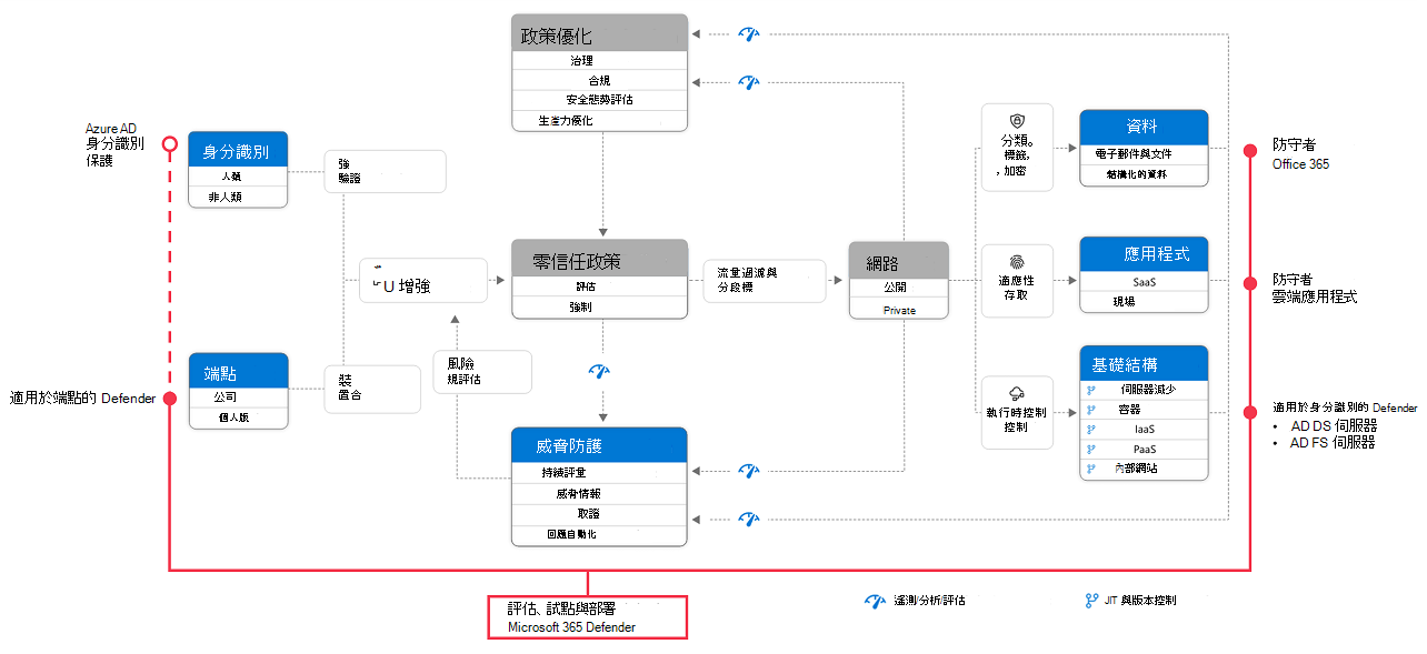 若想為您的零信任策略與架構增添Microsoft Defender 全面偵測回應,請前往試點頁面並部署Microsoft Defender 全面偵測回應,獲得系統化的試點與部署Microsoft Defender 全面偵測回應元件指南。 下表總結這些主題的內容。