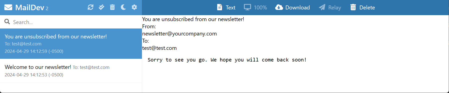 下一個 API 是 unsubscribe 端點。 此端點用來取消訂閱電子報。