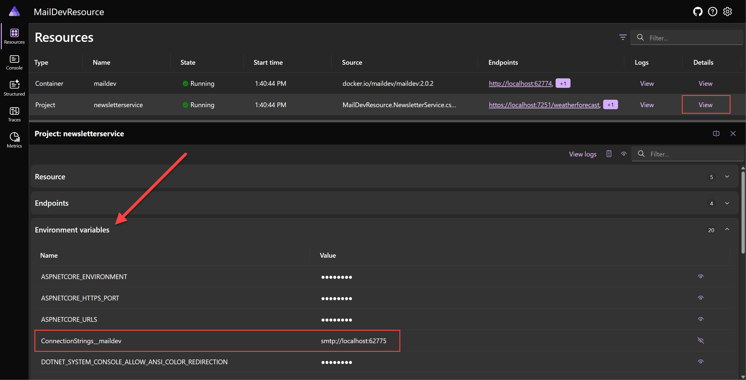 connectionString 欄位會參考指令清單中 maildev 資源的其他部分,以產生最終字串: