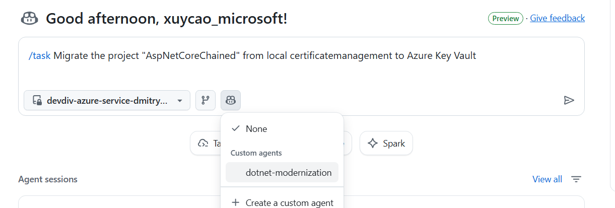 本文將展示如何在 Copilot Coding Agent 中使用 GitHub Copilot 應用程式現代化,遷移 .NET 應用程式。 代理在背景獨立運作以完成現代化任務。 透過問題或 pull requests 來委派任務;代理會在雲端執行來協助團隊高效完成現代化。