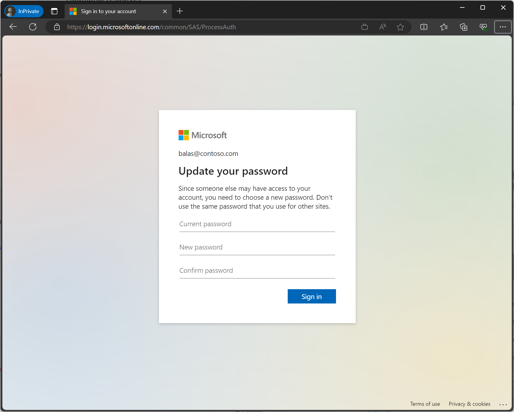 如果使用者面臨風險,而不只是登入,系統管理員可以在條件式存取中設定用戶風險原則,以要求除了多重要素驗證之外,還需要變更密碼。 在此情況下,使用者會看到下列額外畫面。