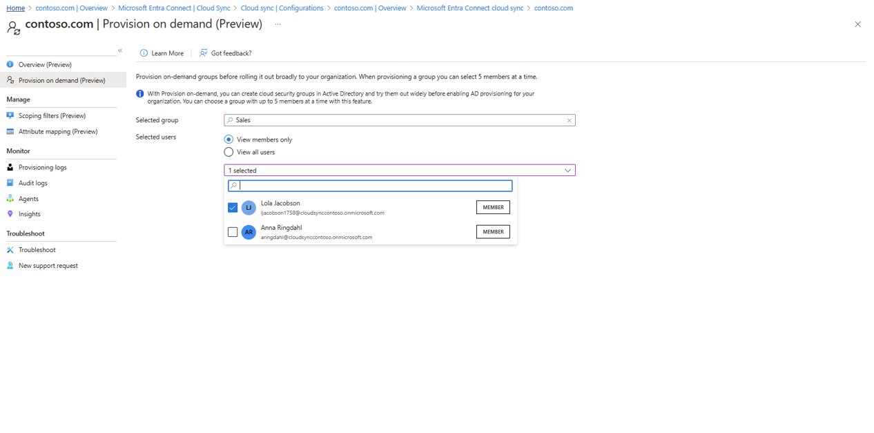 您有兩個同步處理的使用者:Britta Simon 和 Lola Jacobson。 這些使用者存在於內部部署和 Microsoft Entra ID 中。