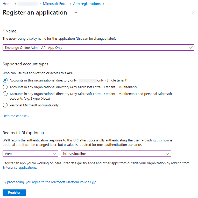 要呼叫 Exchange Online 管理員 API,首先必須在 Microsoft Entra ID 註冊你的應用程式。 應用程式就像一個類別物件。 服務主體就像是類別的一個實例。 欲了解更多資訊,請參閱 Microsoft Entra ID 中的應用程式與服務主體物件。 關於如何在 Microsoft Entra ID 中建立應用程式的詳細視覺流程,請參見 https://aka.ms/azuread-app。