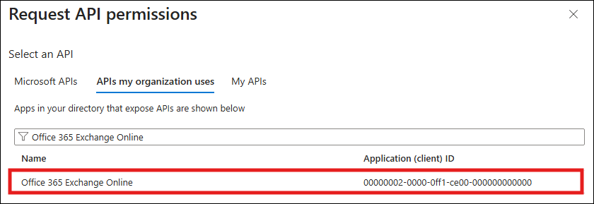 在開啟的「請求 API 權限」跳板中,選擇我組織使用的 API 標籤,在搜尋框輸入 Office 365 Exchange Online,然後從結果中選擇。