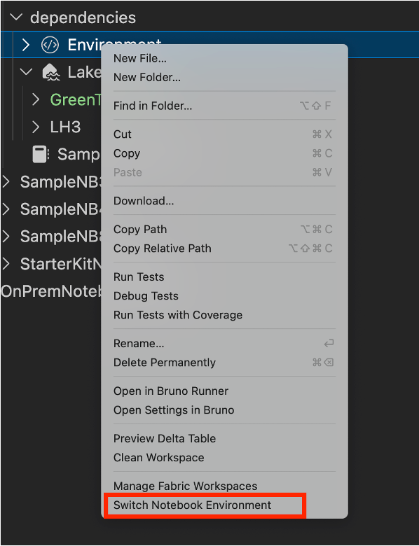 在 VFS 模式下,你可以切換與筆記本相關的環境。 在筆記本中展開相 依 性區塊,再展開 環境區塊 以查看目前的環境。 要切換到不同環境,請右鍵點擊 「環境 」區塊並選擇 「切換筆記本環境」。 這會開啟工作區中可用的環境清單。 選擇你想使用的環境。 切換後,筆記本會使用新的環境來執行程式碼區塊。