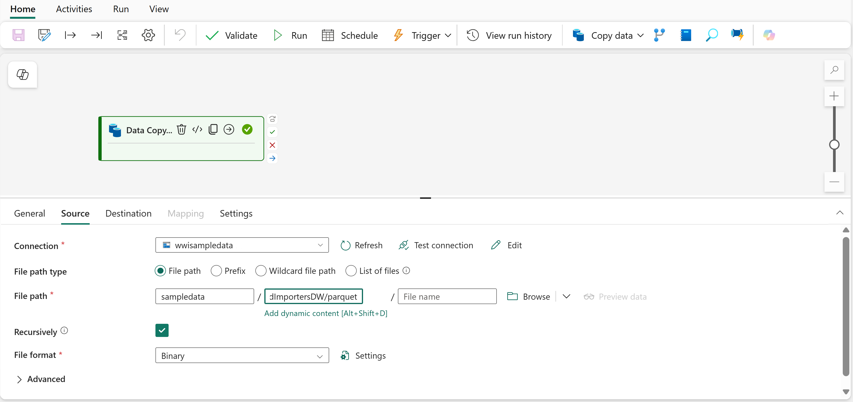 目錄名稱 (第二個文字方塊):WideWorldImportersDW/parquet遞迴 已核對 檔案格式 Binary 從所選複製資料活動的 目的地 索引標籤中,指定下列屬性: