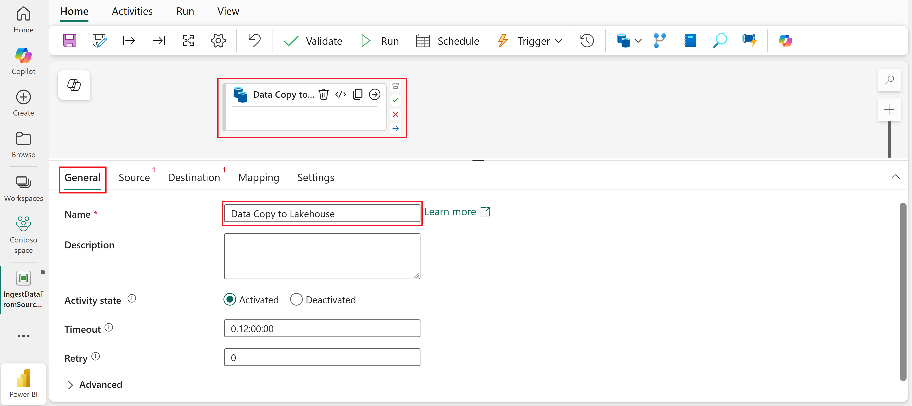 此動作會觸發從基礎資料來源到指定 Lakehouse 的資料複製,最多可能需要一分鐘的時間才能完成。 您可以在 [輸出] 索引標籤下監視管線的執行及其活動。活動狀態會從 [佇列]> [進行>中] [成功] 變更。