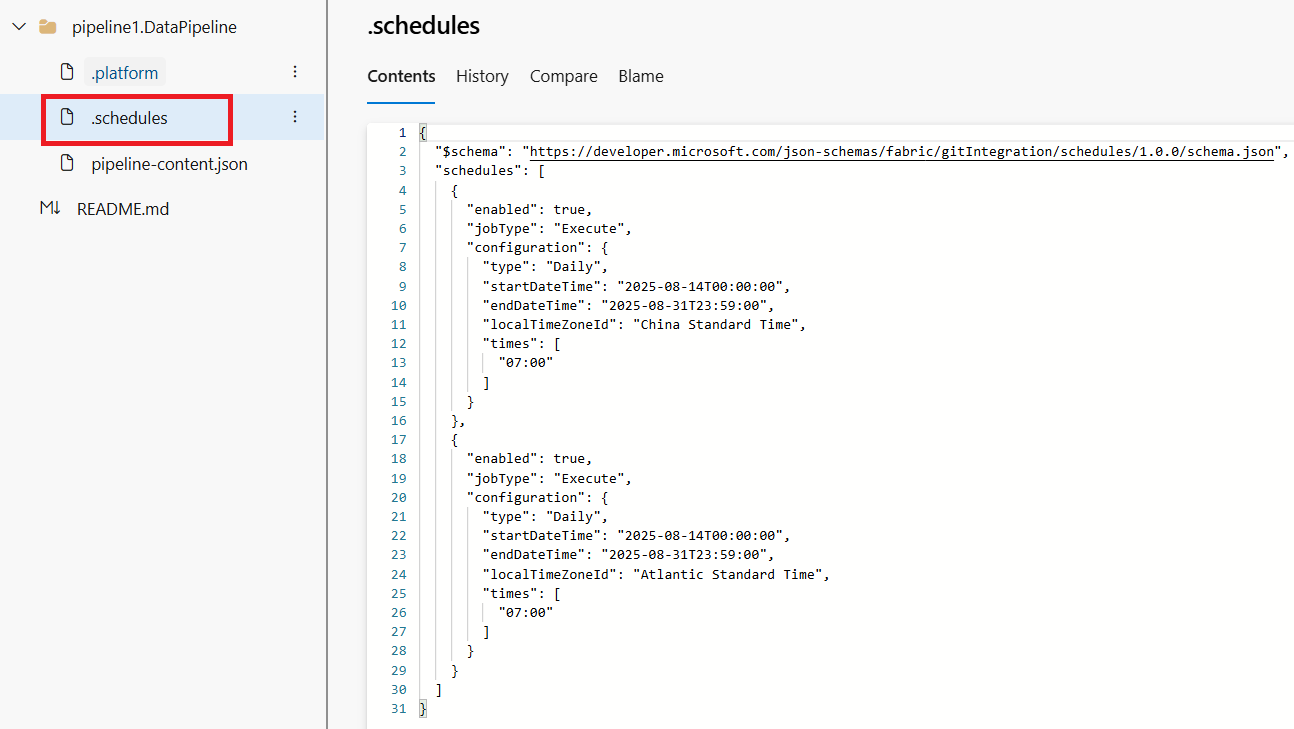 當你為管線建立排程時,它會自動加入連接到你工作區的 Git 儲存庫,並存入管線定義中的 .schedules 檔案。