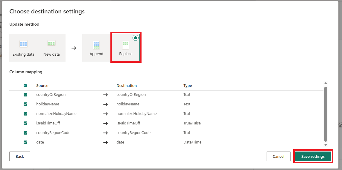 設定來源資料並將其對應到目標 Lakehouse 資料表。 選取 [表格] 以適用於 [根資料夾],並為 [載入設定] 選取 [載入至新表格]。 提供資料表名稱,然後選取 [下一步]。