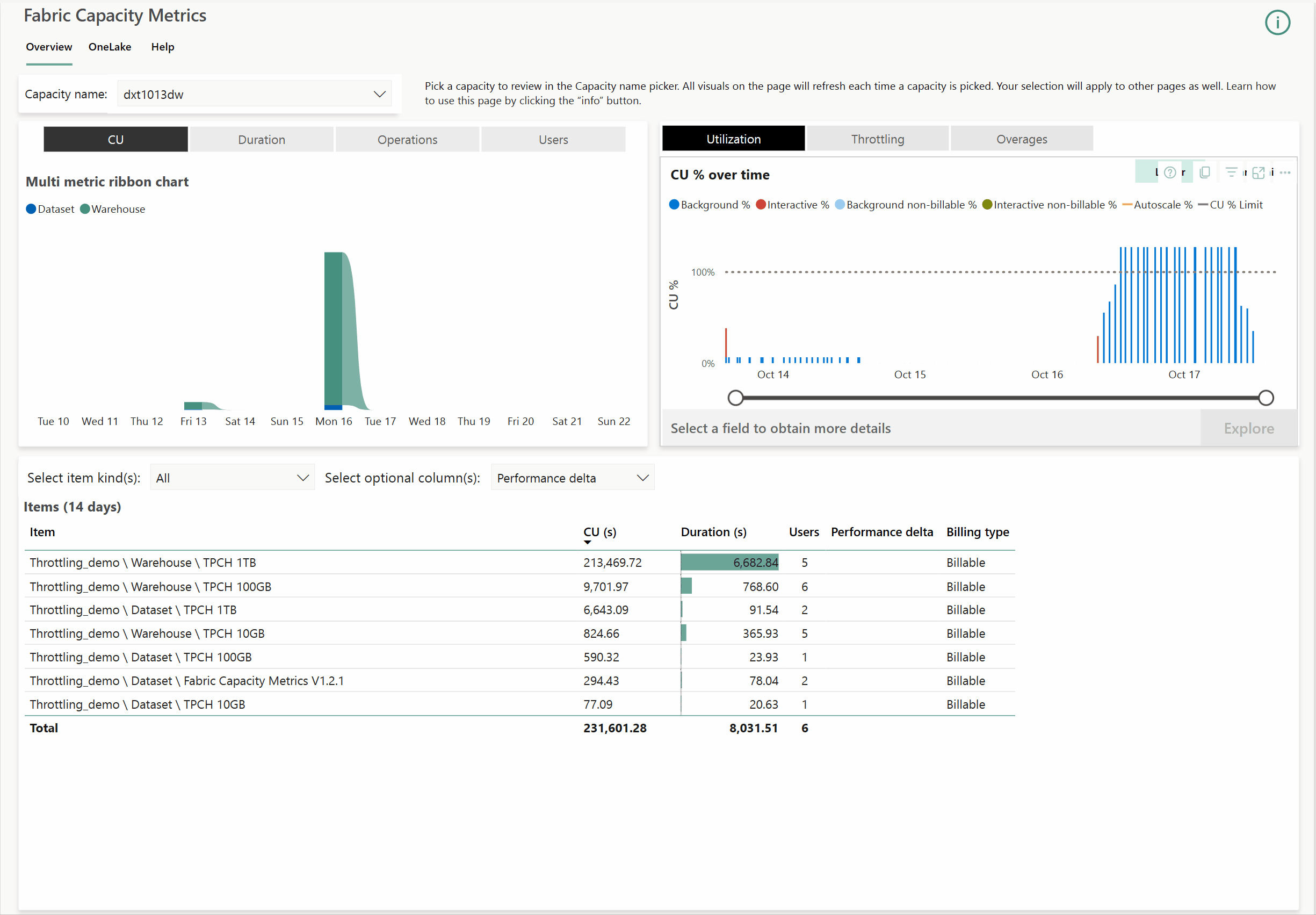 下面的動畫影像示範了幾個步驟,您可以遵循這些步驟來鑽研利用率、節流和超額資訊。 如需詳細資訊,請瀏覽 Microsoft Fabric 中的節流。