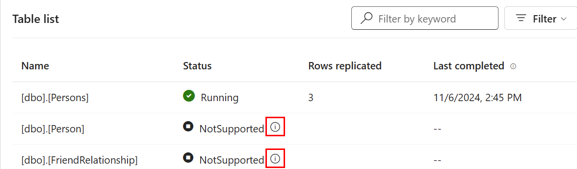執行:資料正在複寫。 執行時出現警告:從資料表複寫資料時出現非嚴重錯誤的警告。 停止/已停止:複寫已停止。 錯誤:該資料表的複寫發生嚴重錯誤。 NotSupported:由於數據表中不支援的功能,復寫已防止,通常是 不支持的數據類型。 |