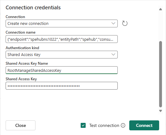 在彈出視窗中,應該會自動填入所有欄位(事件中樞命名空間、事件中樞、聯機名稱、驗證種類、共用存取金鑰名稱和共用存取金鑰值)。 您可能想要更新連線名稱。 例如: