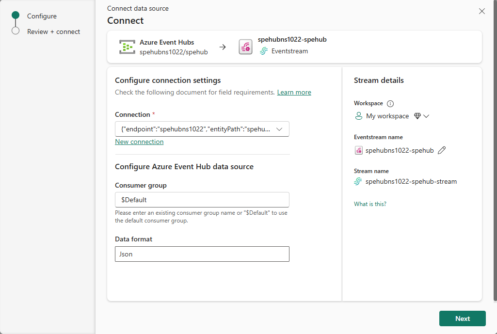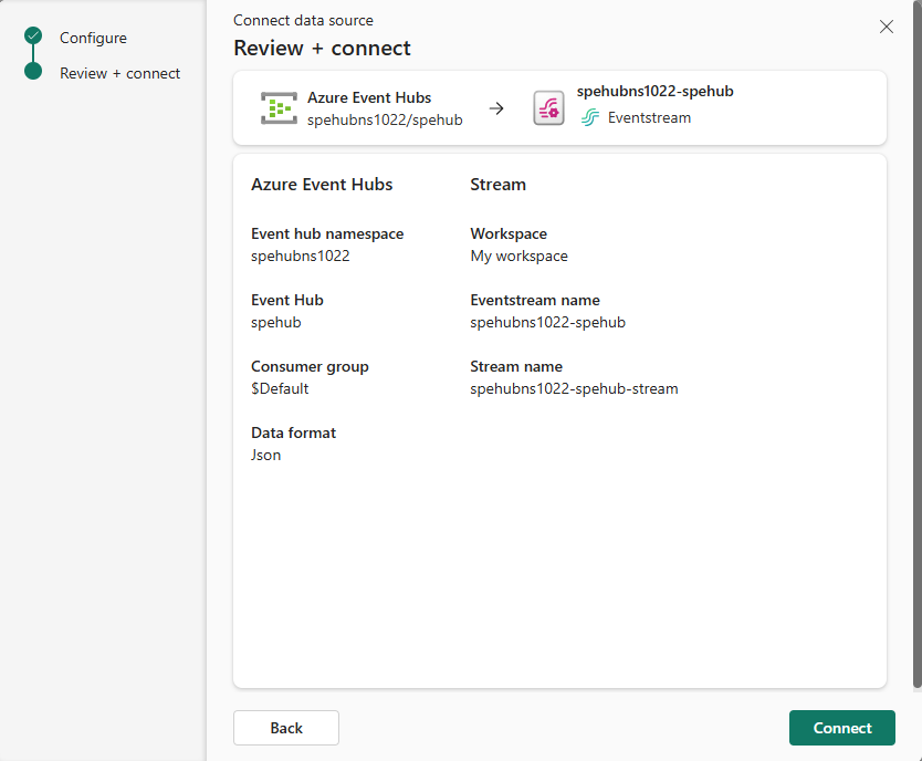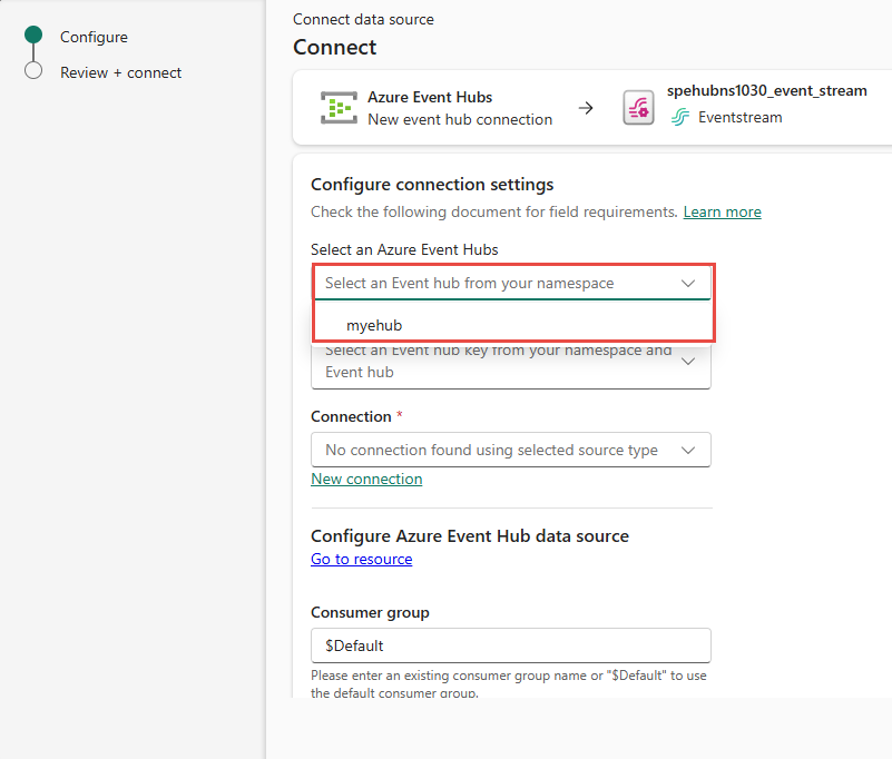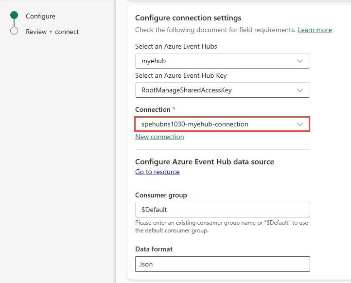 mynamespace-myehub-connection。 選取視窗底部的 [連線 ]。 您會在 [ 連線 ] 下拉式清單中看到連線。 下次啟動相同事件中樞的 [連線精靈] 時,您會在下拉式清單中看到此連線。略過 [數據源] 頁面區 段,然後繼續前往 [ 設定並連線至 Azure 事件中樞資源 ] 區段。