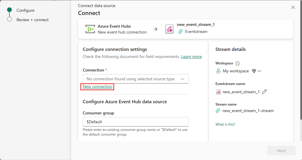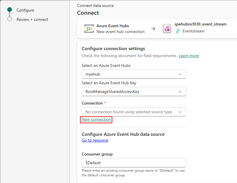 如果有與事件中樞的現有連線,則會顯示在 [ 連線] 的下拉式清單中。 選取它。 如果沒有,請選取 [ 新增連線 ] 以建立事件中樞的連線。