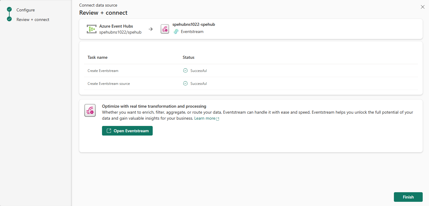 在 [ 檢閱 + 連線 ] 頁面上,如果您選取 [ 開啟事件串流],精靈會開啟它為您建立的事件串流,並將選取的事件中樞當做來源。 若要關閉精靈,請選取頁面底部的 [ 完成 ]。