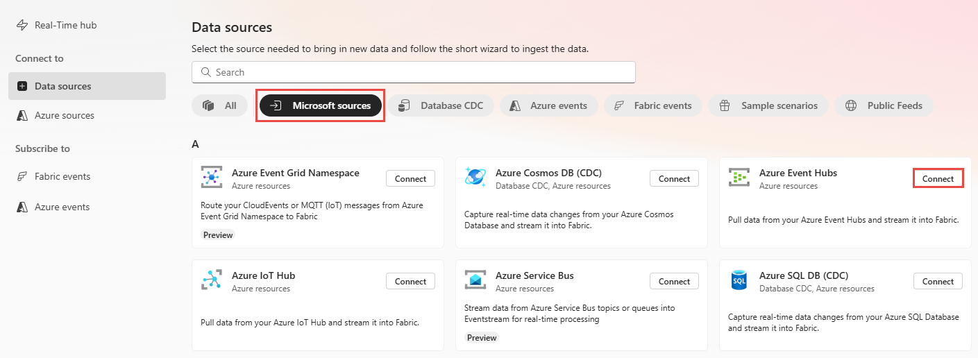 在 數據源 頁面上,選取頂端的 [Microsoft 來源] 類別,然後在 Azure 事件中樞 磚上選取 [連線]。