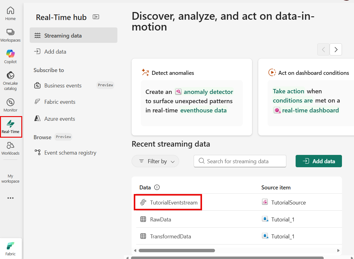 在中樞頁面上的 [ 最近串流] 區段中,從父系為 eventstream 的數據表中選取數據流。