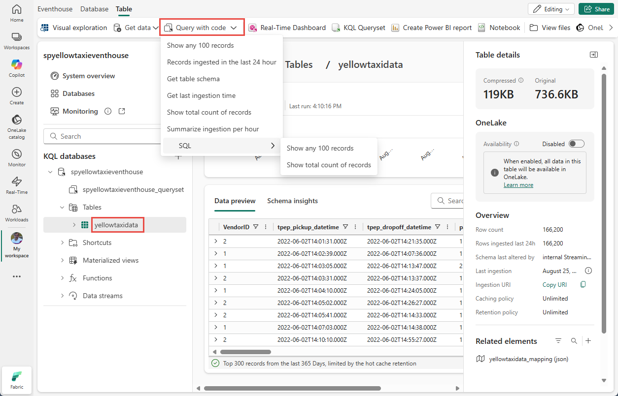 選取您要執行的 KQL 查詢 。 若要執行範例 SQL 查詢,請選取 [SQL],然後選取您要執行的 SQL 查詢。 查詢會自動執行並顯示結果,如下圖所示。