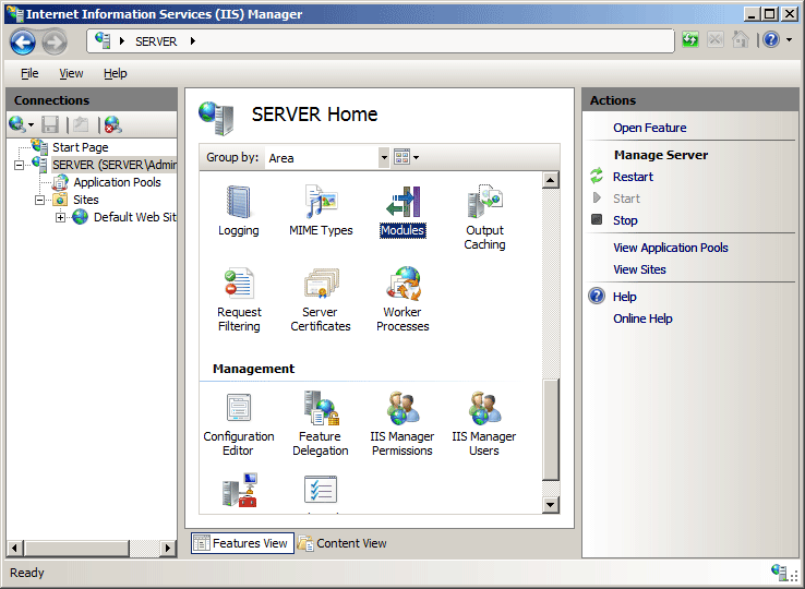 在伺服器、網站或應用程式 [首頁] 頁面上,按兩下 [模組]。