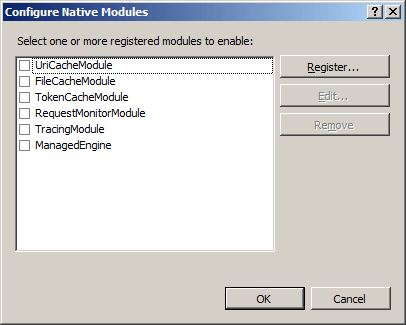 在 [ 設定原生模組 ] 對話方塊中,選取您剛才註冊之原生模組的選項,按一下 [ 確定],然後再按一下 [ 確定 ]。 這可讓原生模組執行,並將其提供給網頁伺服器上的網站和應用程式使用。
